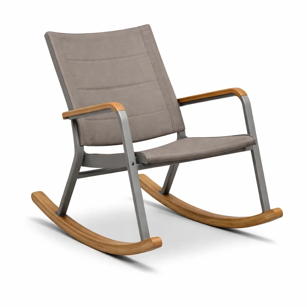Fauteuil à bascule en acier et tissu avec accoudoirs en bois